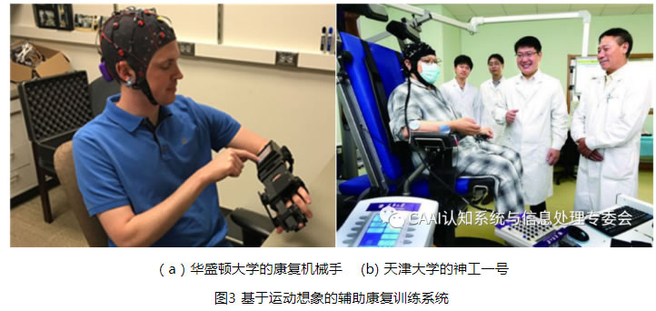 美國凱斯西儲大學Daly等通過運動想象檢測大腦皮層神經元的激活情況,表明BCI系統能有效地輔助患者誘發腦功能重塑并降低大腦皮層的異常激活。即主動的運動感知和被動外部設備相結合形成主被動康復訓練系統,將有利于受試者肢體的運動功能康復[4]。華盛頓大學Bundy等通過健側手部動作運動意圖輔助患者控制外骨骼機械手,實現了患者在日常生活中執行康復訓練[5],如圖3(a)所示。主被動康復訓練系統不僅能輔助正常受試者康復訓練,而且在患者的康復訓練中也取得了一定的進展。德國圖賓根大學VárkutiB等通過運動想象控制MIT-MANUS機器人輔助患者上肢執行康復訓練,結果表明上肢運動功能得到明顯改善[6]。如圖3(b)所示天津大學明東教授團隊通過患者肘關節屈-伸運動想象控制“神工一號”康復機器人輔助肘關節的康復運動,增強了康復訓練效果。西安交通大學徐光華教授團隊研究了目標誘導的運動想象刺激范式,證明了有目標導向的運動想象增強了對大腦皮層的激活并改善運動想象的能力[7]。韋恩州立大學Whyte等進一步提出了規范康復訓練體系可幫助患者主動參與康復訓練[8]。