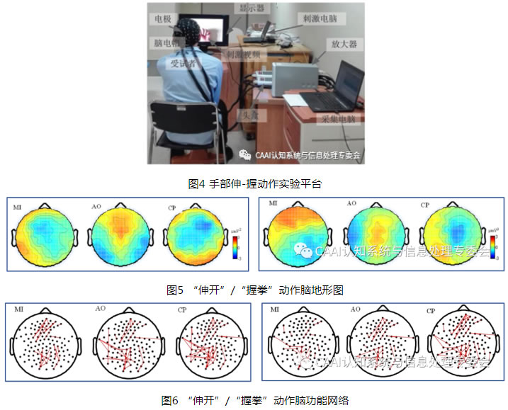 為了提G運動想象動作與所需要的康復肢體的直接相關性,本課題組設計了手部伸-握動作直接相關的運動想象和動作觀察相結合的復合范式實驗,以實現更好的手部主動康復。運動想象是讓受試者去想象某一個動作,不用產生任何肌肉活動,調動主觀意念在心理上反復模擬或復現相應動作。動作觀察是讓受試者觀看日常生活手的基本動作(如抹桌子、洗衣服等視頻動作),然后盡力去模仿視頻中所出現的動作。通過ERSP(時間相關譜擾動)、腦地形圖和腦功能網絡計算分析了伸-握動作運動想象和動作觀察對大腦皮層的激活規律。