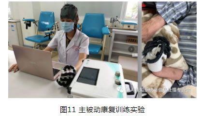 手部主被動訓練系統可分為主動康復和被動康復兩個部分。在主動康復訓練中,對于患者主動意圖的感知有兩種:一種是在多范式刺激大腦皮層的基礎上,從增強的EEG 中直接提取單側手部伸-握動作精細意圖的EEG 特征,實現對受試者手部動作的精細意圖感知;另一種是發揮不同模式如EEG、眼電圖(Electrooculogram,EOG)和肌電圖(Electromyogram, EMG)模式的優勢,構建多模式協同控制策略以產生更多的控制指令。在被動康復訓練中,通過主動運動意圖產生的控制指令或直接輸入指令對軟體康復手進行驅動控制,實現軟體康復手輔助手部執行康復訓練或進行日常生活。實驗驗證了系統輔助患者在線被動康復訓練,通過正常受試者在線控制康復機械手輔助執行伸-握動作,其平均正確率達到92.71%,基本滿足主被動康復訓練的要求,也提升了主被動康復系統的實用化水平。同時,該手部主被動康復訓練系統成功在多家醫院和兩家企業進行康復試用。