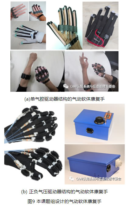 鑒于拉線式軟體康復手的驅動傳動系統較復雜、對手的壓迫感較強,液壓軟體康復手重量較大、有泄露污染的風險,本課題組對重量更輕、成本更低、驅動控制較為簡單的氣動軟體康復手展開了研究。前期,本課題組利用限制層和纖維約束的單氣腔驅動器結構設計,并基于電容變化原理利用介電彈性材料制作柔性傳感器,設計了如圖9(a)所示的集成柔性傳感器的氣動軟體康復手,改變限制層方向,可以輔助人手分別實現主動伸展和主動屈曲運動,并檢測手指彎曲角度進行康復效果評估[13]。但是該氣動軟體康復手無法輔助人手實現拇指的內收/外展運動,也無法同時實現伸展/屈曲運動的雙向主動訓練。為此,本課題組又利用波紋管制作的正負氣壓驅動器制作了如圖9(b)所示的氣動軟體康復手。該氣動軟體康復手僅有149克,采用開放式手套,通過欠驅動可以輔助手指實現伸展/屈曲運動和拇指的內收/外展運動的主動訓練;配套的便攜式氣動箱體積小、重量輕,G級康復版氣動箱可調節六個輸出氣路的壓力和流量;實驗表明,伸展/屈曲驅動器在伸展時的大作用力為4.6N,內收/外展驅動器在內收時大作用力為8.1N。當前,該氣動軟體康復手的驅動器設計、控制設計仍在不斷地進行優化。