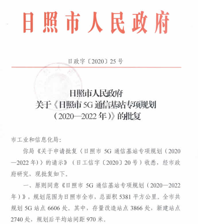《日照市5G通信基站專項規劃(2020-2022年)》
