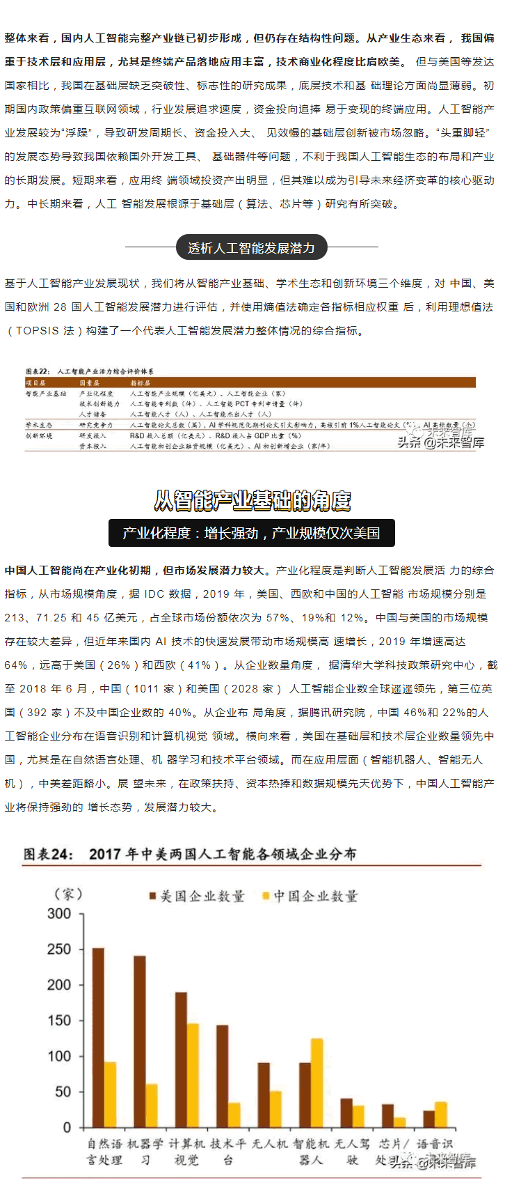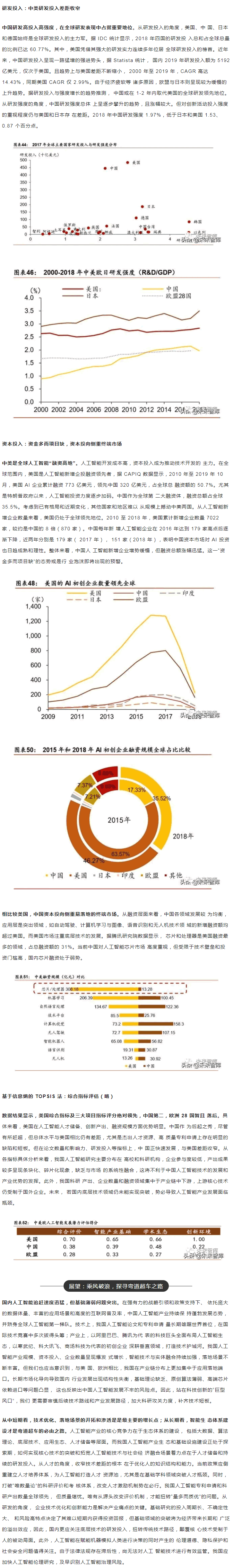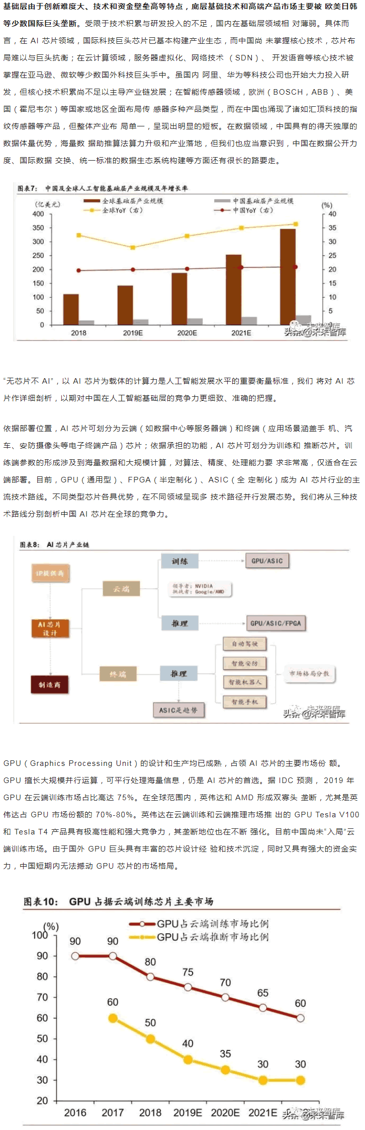 范圍內(nèi),中美“雙雄并立”構(gòu)成人工智能D一梯隊,日本、英國、以色列和法國等發(fā) 達(dá)國家乘勝追擊,構(gòu)成D二梯隊。同時,在D層設(shè)計上,多數(shù)國家強(qiáng)化人工智能戰(zhàn)略布局, 并將人工智能上升至國家戰(zhàn)略,從政策、資本、需求三大方面為人工智能落地保駕護(hù)。后起之秀的中國,局部L域有所突破。中國人工智能起步較晚,發(fā)展之路幾經(jīng)沉浮。自 2015 年以來,政府密集出臺系列扶植政策,人工智能發(fā)展勢頭迅猛。由于初期我國政策 側(cè)重互聯(lián)網(wǎng)L域,資金投向偏向終端市場。因此,相比美國產(chǎn)業(yè)布局,中國技術(shù)層(計算 機(jī)視覺和語音識別)和應(yīng)用層走在世界前端,但基礎(chǔ)層核心L域(算法和硬件算力)比較 薄弱,呈“頭重腳輕”的態(tài)勢。當(dāng)前我國人工智能在國家戰(zhàn)略層面上強(qiáng)調(diào)系統(tǒng)、綜合布局。