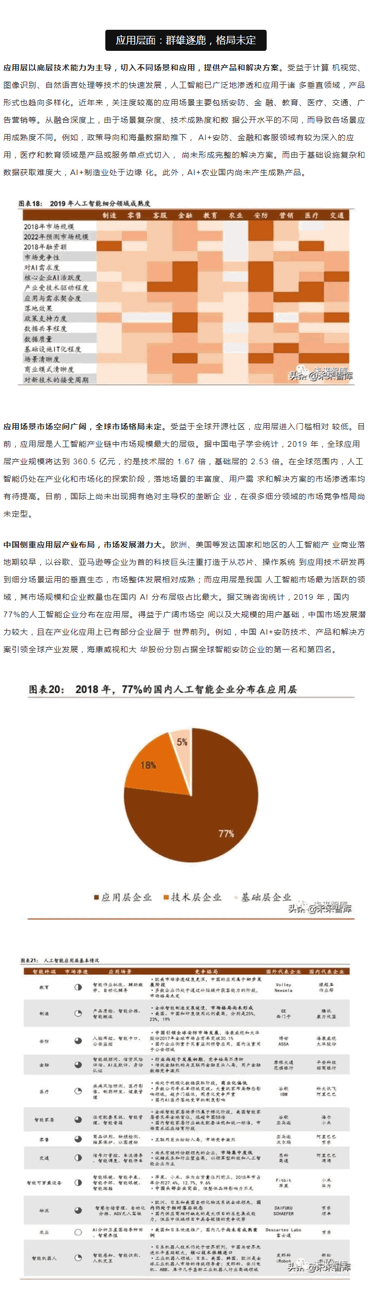 目前,人工智能產(chǎn)業(yè)的生態(tài)系統(tǒng)正逐步成型。依據(jù)產(chǎn)業(yè)鏈上下游關(guān)系,可以將人工智 能劃分為基礎(chǔ)支持層、中間技術(shù)層和下游應(yīng)用層。基礎(chǔ)層是人工智能產(chǎn)業(yè)的基礎(chǔ),主要提 供硬件(芯片和傳感器)及軟件(算法模型)等基礎(chǔ)能力;技術(shù)層是人工智能產(chǎn)業(yè)的核心, 以模擬人的智能相關(guān)特征為出發(fā)點(diǎn),將基礎(chǔ)能力轉(zhuǎn)化成人工智能技術(shù),如計算機(jī)視覺、智 能語音、自然語言處理等應(yīng)用算法研發(fā)。其中,技術(shù)層能力可以廣泛應(yīng)用到多個不同的應(yīng) 用L域;應(yīng)用層是人工智能產(chǎn)業(yè)的延伸,將技術(shù)應(yīng)用到具體行業(yè),涵蓋制造、交通、金融、 醫(yī)療等 18 個L域,其中醫(yī)療、交通、制造等L域的人工智能應(yīng)用開發(fā)受到廣泛關(guān)注。
