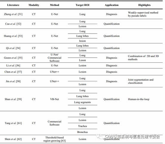 此環(huán)節(jié)的作用在于,對疑似患者肺部區(qū)域拍攝而得到的圖像進(jìn)行預(yù)處理,以提供后續(xù)操作。實(shí)施層面,此環(huán)節(jié)包含兩部分工作:肺部區(qū)域劃分和損傷區(qū)域。表1是一些圖像劃分在COVID-19應(yīng)用中的研究匯總。
