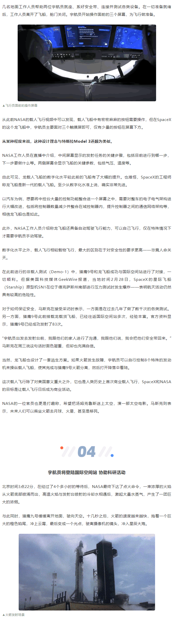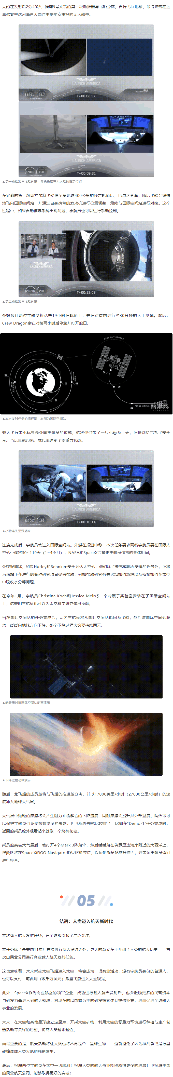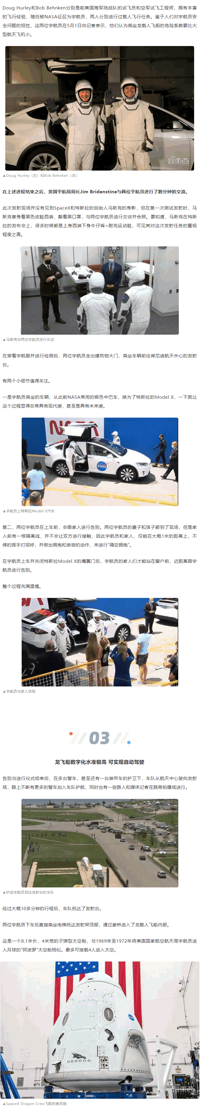 對(duì)SpaceX來(lái)說(shuō),這是其成立近20年來(lái)首次執(zhí)行航天產(chǎn)業(yè)中艱巨、技術(shù)難度G的載人航天任務(wù),意味著其航天技術(shù)實(shí)現(xiàn)了新的突破,發(fā)展到了一個(gè)新的階段,受到了NASA乃至美國(guó)官方的完全認(rèn)可。