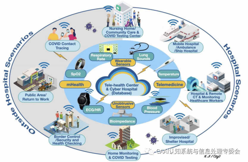 圖1 可穿戴設(shè)備在不引人注目的傳感器和遠(yuǎn)程保健系統(tǒng)在流行病期間的應(yīng)用場(chǎng)景(上面的一些原始設(shè)計(jì)概念是從R.Pettigrew博士2012年在國(guó)家科學(xué)院舉行的IEEE生命科學(xué)大挑戰(zhàn)會(huì)議上的演示中借用的)[1]