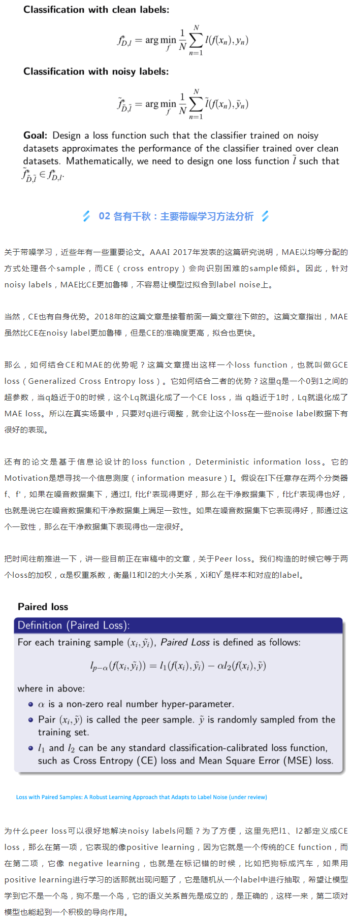 噪音普遍存在,所以我們需要訓練神經網絡進行帶噪學習,并且要能實現比較好的性能。那么noise label learning的目標是設計一個loss function,使得在noisy labels下訓練得到的解,在性能上接近在clean labels下訓練得到的解。