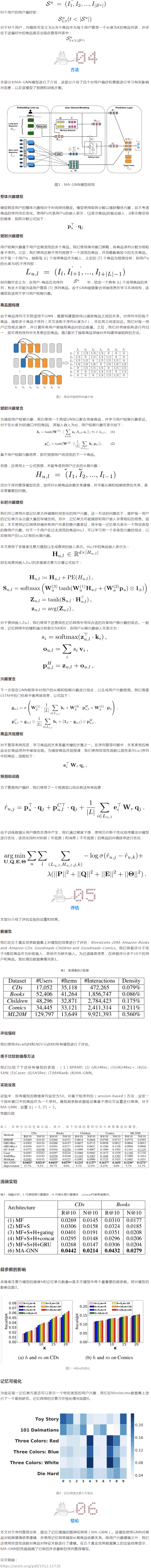 用戶-商品交互的時間順序可以揭示出推薦系統中用戶行為隨時間演進的序列性特征。用戶與之交互的商品可能受到用戶曾經接觸的商品的影響。但是,用戶和商品數量的大量增加,使得序列推薦系統仍然面臨很多重要問題:(1)對短時用戶興趣建模的困難;(2)捕捉用戶長期興趣的困難;(3)對商品共現模式的建模效率較低。為了應對這些挑戰,本文提出了一個記憶增強的圖神經網絡(memory augmented graph neural network, MA-GNN),以捕捉用戶的長期和短期興趣。