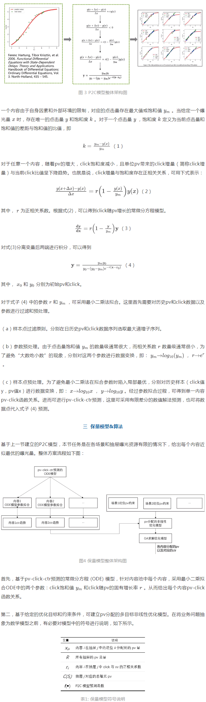 為內(nèi)容分配曝光量涉及到關(guān)于曝光和點(diǎn)擊建模問題,以及內(nèi)容的未來點(diǎn)擊量預(yù)測問題。內(nèi)容曝光、點(diǎn)擊和播放等構(gòu)成了一個(gè)復(fù)雜的非線性混沌系統(tǒng),不僅取決于內(nèi)容質(zhì)量本身,也取決于內(nèi)容更新時(shí)間、更新策略和用戶點(diǎn)擊習(xí)慣等。傳統(tǒng)的統(tǒng)計(jì)預(yù)測模型無法闡述外部環(huán)境的各種干擾因素以及系統(tǒng)的混沌特性,即無法從機(jī)理上描述系統(tǒng)本質(zhì)。針對此問題,我們首先通過分析新熱內(nèi)容的歷史曝光點(diǎn)擊日志,使用常微分方程建立了新熱內(nèi)容曝光敏感模型,即pv-click-ctr模型(簡稱P2C模型)。在P2C模型基礎(chǔ)上,結(jié)合各場景和抽屜的曝光資源約束,給出一種曝光資源約束下的多目標(biāo)優(yōu)化保量框架與算法。