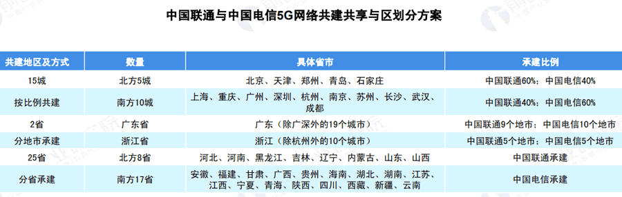 雙方將在15個城市分區承建5G網絡(以雙方4G基站(含室分)總規模為主要參考,北京、天津、鄭州、青島、石家莊北方5個城市, 聯通運營公司與中國電信的建設區域比例為6:4;上海、重慶、廣州、深圳、杭州、南京、蘇州、長沙、武漢、成都南方10個城市,聯通 運營公司與中國電信建設區域的比例為4:6)。