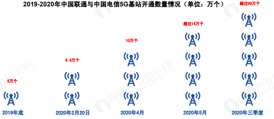 截至2020年2月20日,中國聯通與中國電信已累計開通5G基站6.4萬個,網絡覆蓋所有直轄市、主要省會城市,以及京津冀、長三 角、大灣區等區域的重點城市。截至2020年4月,已累計開通5G基站10萬個,在全國31省開通5G共建共享,實現了50多個城市的5G正式 商用。