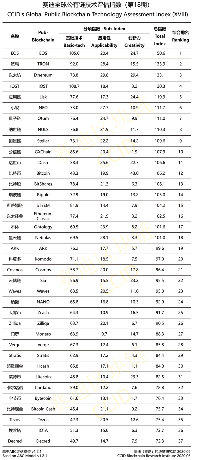 2020年6月18日,中國電子信息產業發展研究院(賽迪研究院)發布第18期賽迪公有鏈技術評估指數,對37條知名公有鏈從技術維度進行綜合考量并給出排名。