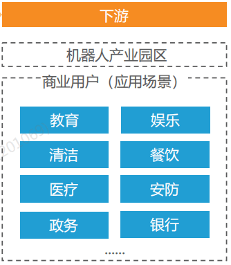 公共服務機器人產業鏈可分為,上游核心零部件、軟件系統開發、中游機器人本體制造、下游機器人分銷商與各場景商業用戶。