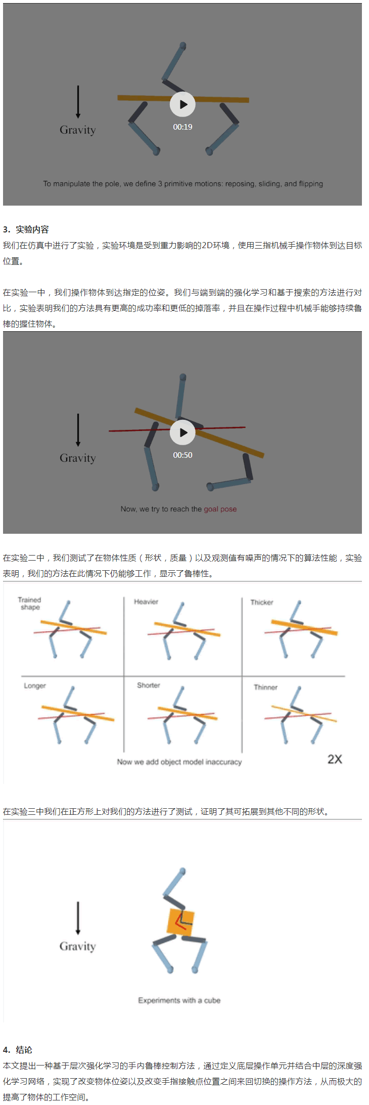 傳統上,手內操作有兩類解決方案,一類是基于模型的方法(model-based method),通過對抓取的動力學建模,來控制手指移動帶動物體姿態。這種辦法好處在于穩定性強,模型簡單,但問題在于難以實現較長和復雜的手內操作流程,特別是目標位姿和起始位姿相距很遠的情況,因為它們很難規劃手指接觸點的移動;另一類方法是無模型方法(model-free method),通常使用深度強化學習的方法。這類方法優點在于不需要系統模型,但缺點在于穩定性差,并且需要大量數據進行訓練。而我們的方法結合了這兩種方法:在底層使用傳統的動力學建模方式保持穩定的抓取和實現簡單基本的操作單元,在中層通過深度強化學習來進行規劃,選擇不同的操作單元,終實現穩定且復雜的操作流程。我們的方法結合了兩種方法的優點:在底層通過使用基于模型的操作單元,保證了手指與物體之間持續穩定的抓取;在中層使用強化學習進行規劃,從而實現較長和復雜的手內操作流程。
