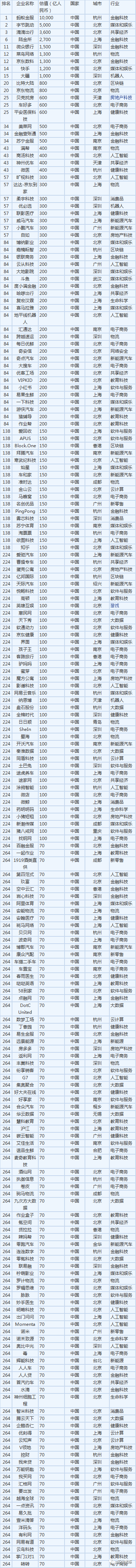螞蟻金服以10000億元估值中國獨角獸企業排名榜首,字節跳動估值5000億排在D二,滴滴出行、陸金所以及微眾銀行排在前五位,估值超過千億的還有菜鳥網絡、京東數科、快手和大疆