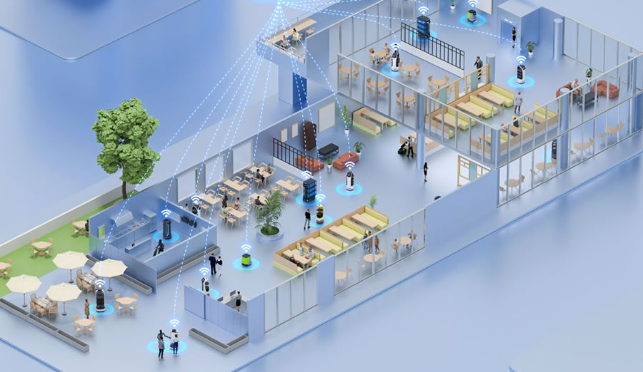 通過物聯網技術支持服務機器人與各類設備(如電梯,門禁系統, 電話系統等)建立實時連接;實時收集周圍環境和設備的數據為機器人提供智能決策支持