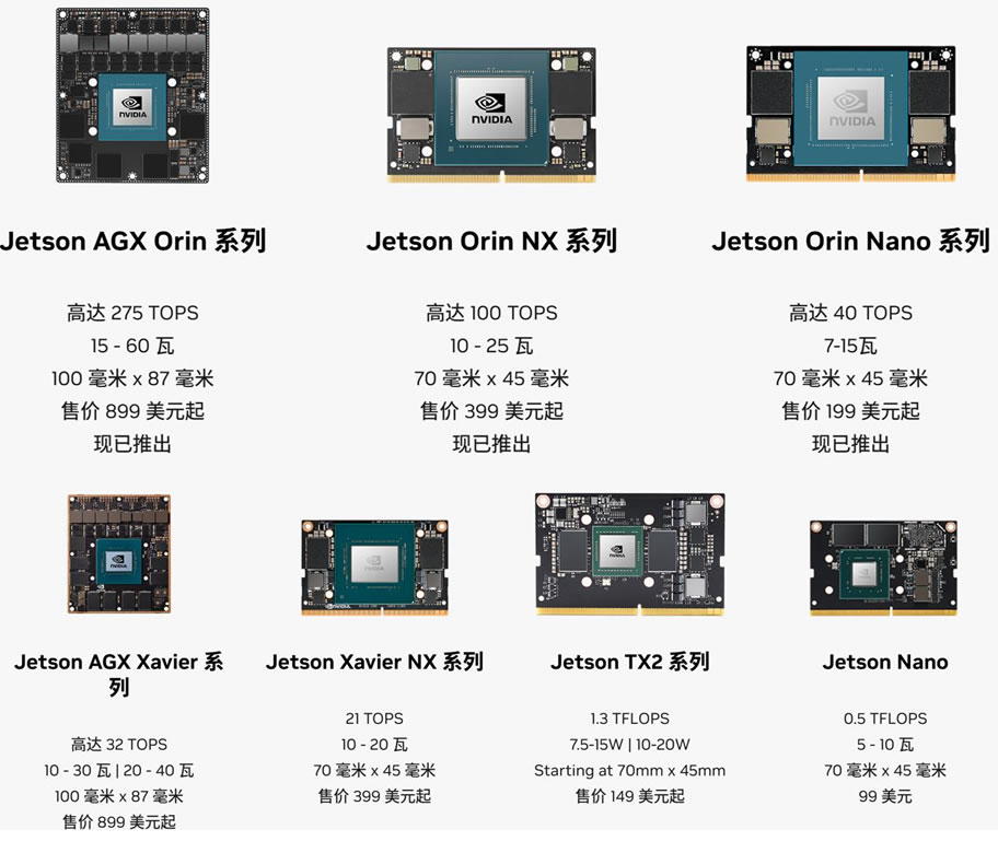 英偉達 Jetson系列是專為機器人和嵌入式邊緣AI應用設計的計算平臺,由Jetson模組、JetPack SDK和生態系統組成,加速軟件開發。 Jetson系列的主要成員包括Jetson Nano、Jetson TX2和Jetson AGX Xavier,適用于不同的應用場景。Jetson Nano是Z小的設備,配備了 128核心GPU和四核ARM Cortex-A57 CPU。Jetson Xavier系列模組具有高達32 TOPS的AI性能,適用于自主機器的視覺測距、傳感器融合、 定位和地圖構建等應用。
