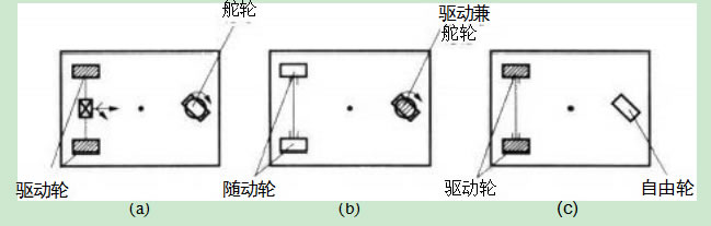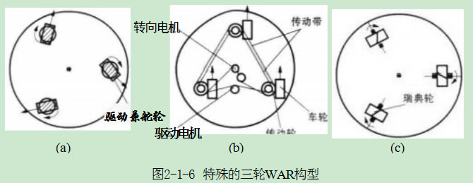 輪配置中也有一些很少見的配置方式,如圖2-1-6所示,圖2-1-6(a) 中 三 個 輪互成120°。車輪不僅可d立驅(qū)動而且可以d立轉(zhuǎn)向;圖2-1-6(b) 三個車輪采用 同步驅(qū)動系統(tǒng)控制,三個車輪同時用來驅(qū)動與轉(zhuǎn)向,這種機器人一個突出的特點是機器人本體相對于地面的姿態(tài)保持不變;圖2-1-6(c) 互成120°布置的三個車輪采用瑞典輪,通過d立驅(qū)動各輪可實現(xiàn)機器人全方位移動。
