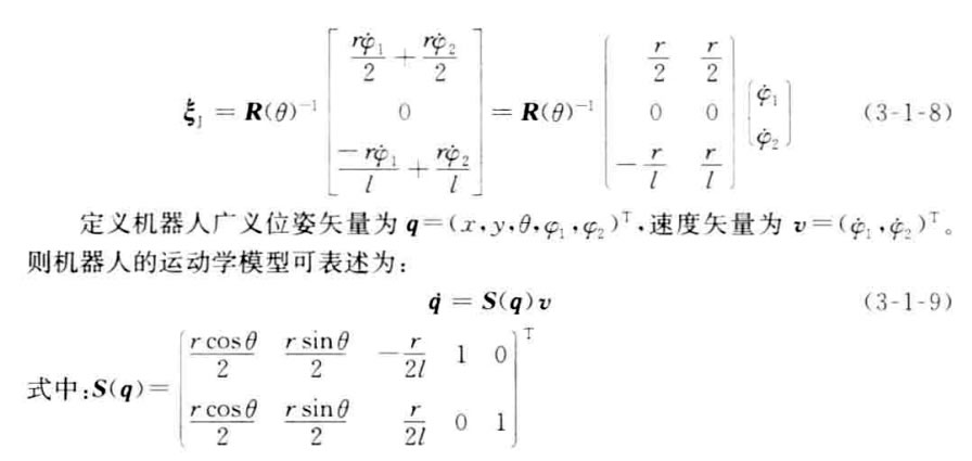 假定機器人在運動中質心的線速度為v(t), 角速度為w(t), 左右兩輪的轉速分別為ψ和 中₂,機器人左右兩輪的運動速度分別為 VI, VR。給定r,1,θ, 以及根據圖3-1-3所示的幾 何關系,考慮到移動機器人滿足剛體運動規 律,下面的運動學方程(3-1-6)成立。