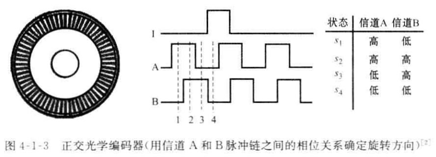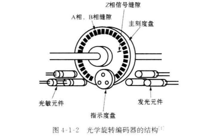 以圖4-1-2為例說明光學編碼器的結構。光學編碼器由發(fā)光元件、屏蔽光的固 定光柵、與轉軸一起旋轉的帶光柵的轉盤和固定的光敏元件組成。發(fā)光元件和光敏 元件安放在碼盤的兩側,當轉盤轉動時,根據(jù)固定的和運動的光柵的排列,光敏元件 接收的光通量會發(fā)生變化。光敏元件輸出的波形經(jīng)過整形后形成脈沖,根據(jù)脈沖計 數(shù),可以得到固定在碼盤上的轉軸的角位移。在測量中,Z后得到的光強信號用閾 值變換成離散的方波,在亮和暗的狀態(tài)之間作選擇。分辨率以每轉周期數(shù)(CPR)度量。Z小的角分辨率可以容易地從編碼器的CPR 額定值計算出。典型的編碼 器可擁有2000 CPR, 而光學編碼器工業(yè)可容易地制造出具有10000 CPR 的 編 碼 器。當然,根據(jù)所需的帶寬,Z關鍵的是編碼器需要足夠快,以計算期望的軸轉速。