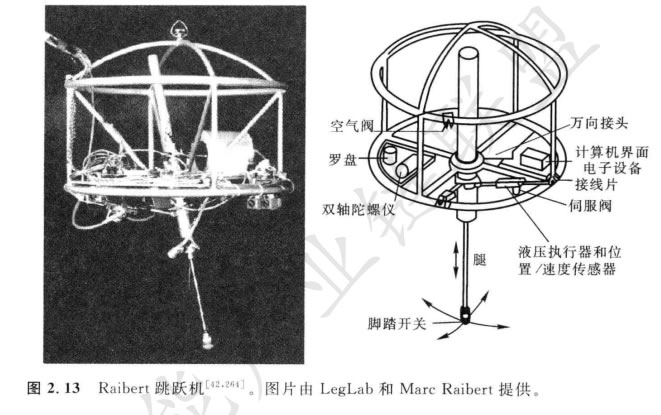 圖2.13表示的是Raibert 跳躍機42,2647,它是已制作的Z有名的單腿跳躍機器人 之一。這個機器人通過調節相對于身體的腿角,不斷地修正身體姿態和機器人速度。 激勵是液壓的,包括在立姿向空中跳躍期間腿的高性能縱向伸展。激勵雖然是強有 力的,但這些激勵器需要一個隨時連接到機器人的大型的、外裝的液壓泵。