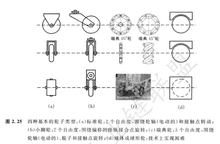 有四種主要的輪子類型,如圖2.25所示。在運(yùn)動(dòng)學(xué)方面,它們差別很大。因此 輪子類型的選擇對(duì)移動(dòng)機(jī)器人的整個(gè)運(yùn)動(dòng)學(xué)有很大的影響。標(biāo)準(zhǔn)輪和小腳輪有一個(gè) 旋轉(zhuǎn)主軸,因而是高度有向的。在不同的方向運(yùn)動(dòng),需要先沿著垂直軸操縱輪子。 這兩種輪的主要差別在于標(biāo)準(zhǔn)輪可以完成操縱而無副作用,因?yàn)樾D(zhuǎn)中心經(jīng)過接觸 片著地;而小腳輪繞偏心軸旋轉(zhuǎn),在操縱期間會(huì)引起一個(gè)力,加到機(jī)器人的底盤。