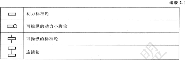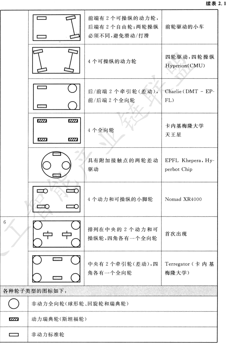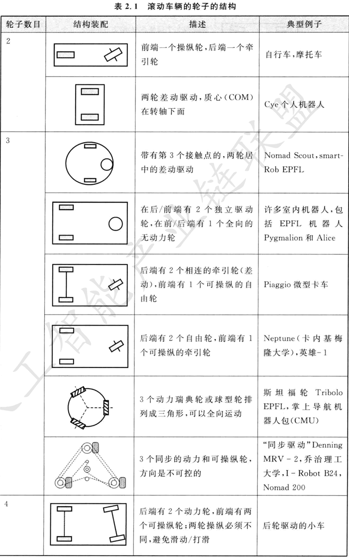 表2.1給出了輪子結構的概貌,按輪子數(shù)目排序。表中描述了特殊輪子類型的選擇和機器人底盤上它們的幾何結構這兩個方面。我們注意到,所示的某些輪子結構在移動機器人的應用中很少用到。例如,兩輪自行車裝配,其機動性中等,可控性 差。再像單腿跳躍機,它根本不能靜止地站著。不過,表中提供了在運動機器人設計 中可能用到的許多種類輪子結構的說明。