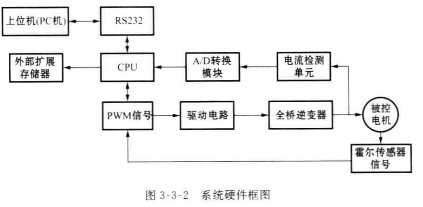系統(tǒng)的硬件框圖如圖3-3-2所示,可以看出基本上包括一個(gè)以TMS320F2812DSP 為核心的DSP 控制板,一塊配套的功率驅(qū)動(dòng)板和一臺(tái)無(wú)刷直流電機(jī)。實(shí)現(xiàn)的 主要功能是控制指令的接收和執(zhí)行,速度信號(hào)的接收和計(jì)算處理,電流采樣信號(hào)接 收和轉(zhuǎn)換,速度閉環(huán)和電流閉環(huán)控制算法的執(zhí)行等。