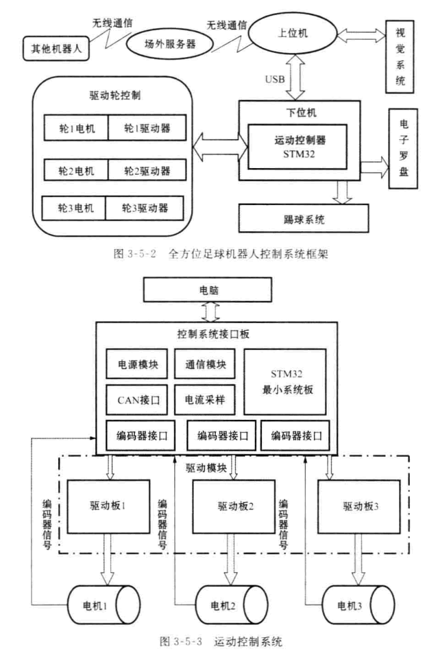 運動控制系統由通信模塊、電源模塊、控制模塊和電機驅動模塊組成。一塊主 控制板(STM32) 控制3塊驅動電路,分別驅動3個全方位輪,實現3軸聯動。當機器人工作時,通信模塊負責從PC 機接收指令數據,包括3個輪子的速度和是否踢 球判斷以及踢球力度。控制模塊將3個輪子的速度發送到運動控制模塊,并產生 一個踢球信號控制氣動踢球系統產生踢球動作。運動控制模塊則控制著3個輪子 的速度,并且將通過閉環采集到的電機碼盤信息獲得的3個輪子的速度反饋回PC 機,供機器人上層策略算法使用。其結構圖如圖3-5-3。通信模塊和運動控制模塊的CPU采用的是 STM32F103CB。