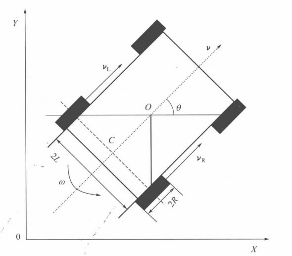 移動機器人能夠直接進行控制的是兩個d立驅動電機,因此采用 [vL,vR] 形式的輸 入控制量,來分別控制兩個驅動輪。下面討論如何將機器人的前進速度v 和轉動速度w 轉 化為機器人兩個輪子的線速度v₁ 和vR。