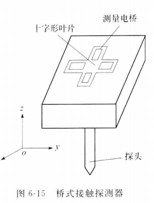 橋式接觸探測器由敏感元件組成,它能夠測量由探 測器施于物體的力F 的三個分力F, 、F, 和 F₂, 見圖6-15。 探測器的探頭直徑為3mm, 長度為12mm, 它與物體相接 觸,并把壓力傳遞到一個柔性的十字形葉片上。葉片上 測量電橋