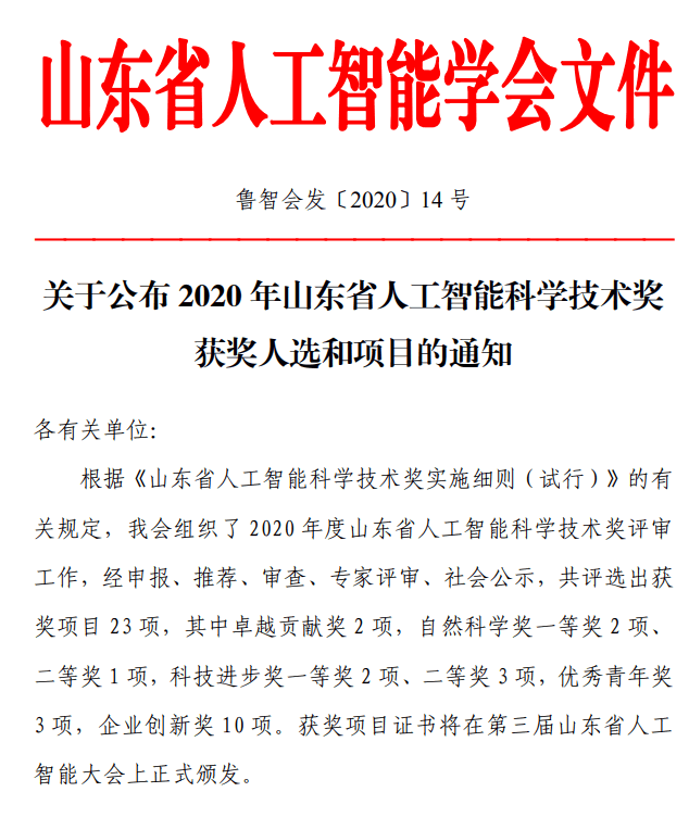 2020年山東省人工智能科學技術獎獲獎名單和項目