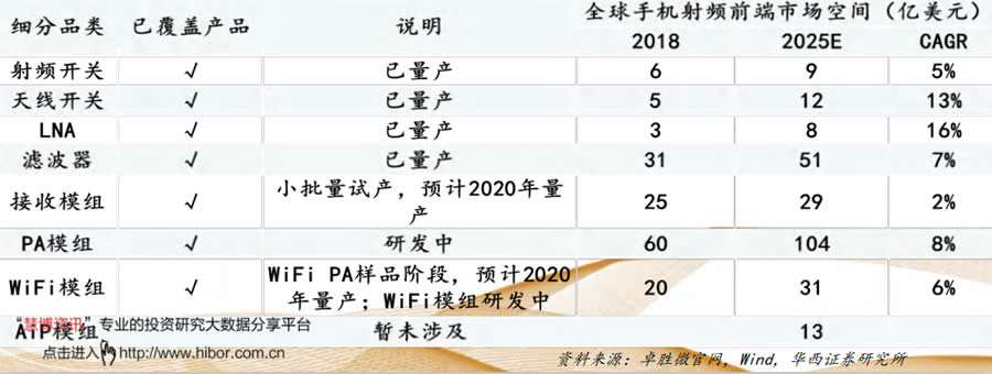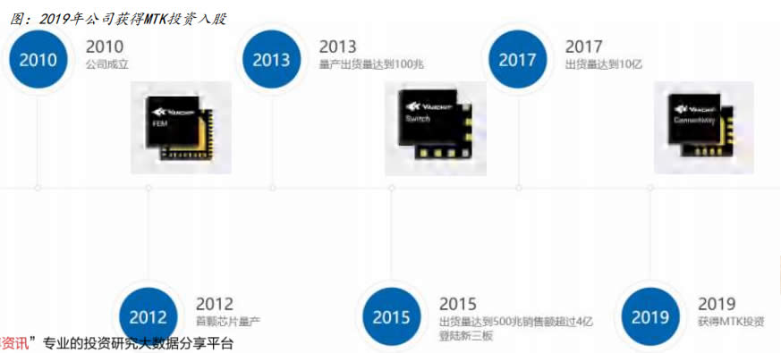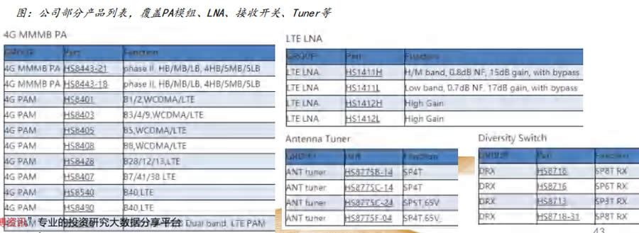 公司以射頻開關(guān)、LNA芯片起家,實現(xiàn) L先手機品牌如三星、小米、華為、vivo、OPPO等重點客戶覆蓋,并在2019年實現(xiàn)射 頻模組產(chǎn)品從無到有的突破。在細分產(chǎn)品中,比較優(yōu)勢明顯,射頻開關(guān)已通過G通的小批 量試產(chǎn)驗證,正式進入量產(chǎn)。DiFEM的成功研制是公司技術(shù)創(chuàng)新的又一里程 碑,打破了海外寡頭在射頻模組L域的壟斷局勢。站在當前時點,公司營收體量小,所處 賽道面向250億美元市場,具備5G換機潮和射頻芯片國產(chǎn)替代的雙重彈性。