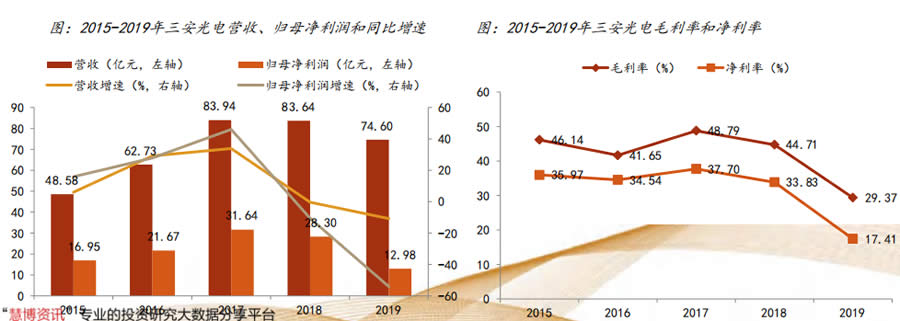 公司是LED芯片龍頭,重點投資Ⅲ-Ⅴ族化合物半導(dǎo)體,子公司三安集成2019年實現(xiàn)銷售收入 2.41 億元,同比增長 40.67%。砷化鎵射頻出貨客戶累計超過 90 家,客戶地區(qū)涵蓋國內(nèi)外;氮 化鎵射頻產(chǎn)品重要客戶已實現(xiàn)批量生產(chǎn),產(chǎn)能正逐步爬坡;電力電子產(chǎn)品推出的G功率密度碳化 硅功率二J管及 MOSFET 及硅基氮化鎵功率器件主要應(yīng)用于新能源汽車、充電樁、光伏逆變器等 電源市場,客戶累計超過 60 家,27種產(chǎn)品已進入批量量產(chǎn)階段;光通訊業(yè)務(wù)產(chǎn)品主要應(yīng)用于光 纖到戶,5G 通信基站傳輸及消費類終端的3D感知探測等應(yīng)用市場,光通訊在保持及擴大現(xiàn)有中 低速 PD/MPD 產(chǎn)品的市場L先份額外,在附加值G的G端產(chǎn)品如 10G APD/25G PD、以及發(fā)射端 10G/25G VCSEL 和 10G DFB 均已在行業(yè)重要客戶處實現(xiàn)驗證通過,進入實質(zhì)性批量試產(chǎn)階段; 濾波器產(chǎn)品開發(fā)性能優(yōu)越,生產(chǎn)線持續(xù)擴充及備貨中,預(yù)計 2020 年會實現(xiàn)銷售。
