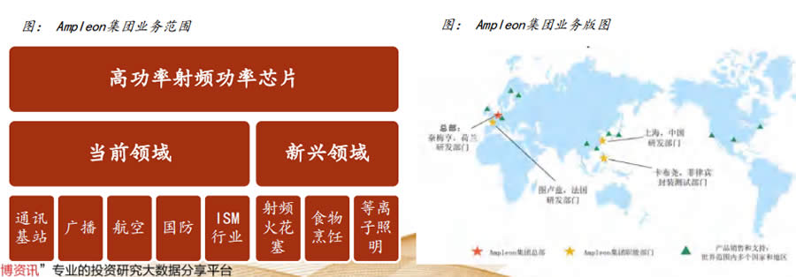 Ampleon集團原為著名半導(dǎo)體企業(yè)NXP的射頻功率部門,在射頻功率芯片行業(yè)擁有超過 50年的運營經(jīng)驗,后經(jīng)剝離成立公司并由建廣資產(chǎn)成功競標。根據(jù)研究機構(gòu)ABI Research 的統(tǒng)計,2016年Ampleon集團在射頻功率半導(dǎo)體行業(yè)的市場占有率為19.6%,排名D二。 公司的射頻功率芯片主要供應(yīng)各大通訊基站設(shè)備制造商。Ampleon的經(jīng)營模式介于IDM模式 與Fabless模式之間,其業(yè)務(wù)涵蓋射頻功率芯片的設(shè)計、封裝測試以及終的銷售環(huán)節(jié),但 不包括晶圓采購、芯片制造及測試等中間環(huán)節(jié)。公司擁有Si LDMOS技術(shù)以及一代G端 半導(dǎo)體射頻氮化鎵技術(shù),GaN業(yè)務(wù)主要通過由晶圓廠商(UMS)代工的方式實現(xiàn)產(chǎn)品出貨。 公司基站芯片業(yè)務(wù)占業(yè)務(wù)總收入的88%。