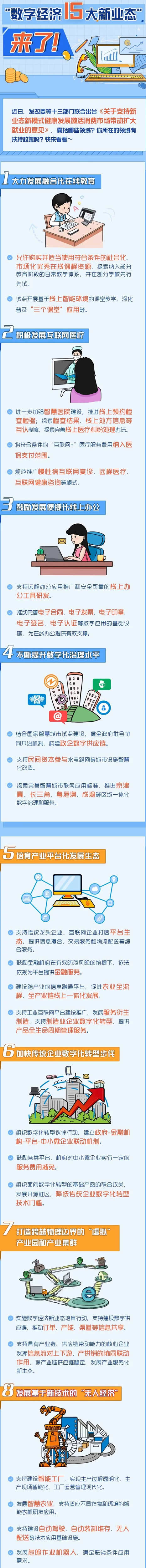 新出臺的舉措重點支持15種新業態新模式——在線教育、互聯網醫療、線上辦公、數字化治理、產業平臺化發展、傳統企業數字化轉型、“虛擬”產業園和產業集群、“無人經濟”、培育新個體經濟支持自主就業、發展微經濟鼓勵“副業創新”、探索多點執業、共享生活、共享生產、生產資料共享及數據要素流通。
