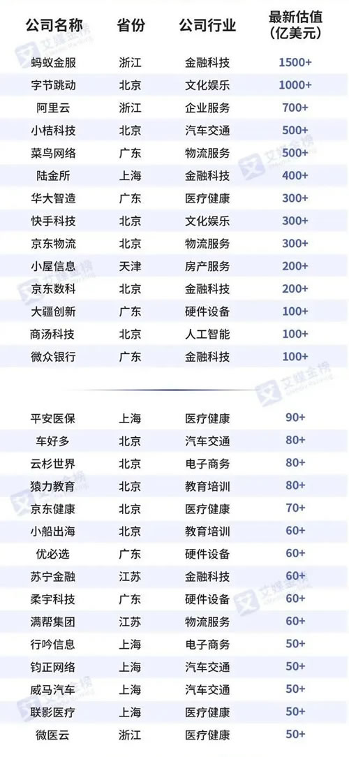 iiMedia Research(艾媒咨詢)數據顯示,2020中國新經濟獨角獸200強榜單中,螞蟻金服、字節跳動、阿里云L居前3位,估值分別突破1500億美元、1000億美元、700億美元;此外排名前10的企業依次為小桔科技、菜鳥網絡、陸金所、華大智造、快手科技、京東物流、小屋信息,估值均在200億美元以上;排名11-20位的企業依次為京東數科、大疆創新、商湯科技、微眾銀行、平安醫保、車好多、云杉世界、猿力教育、京東健康、小船出海,估值均在60億美元以上。