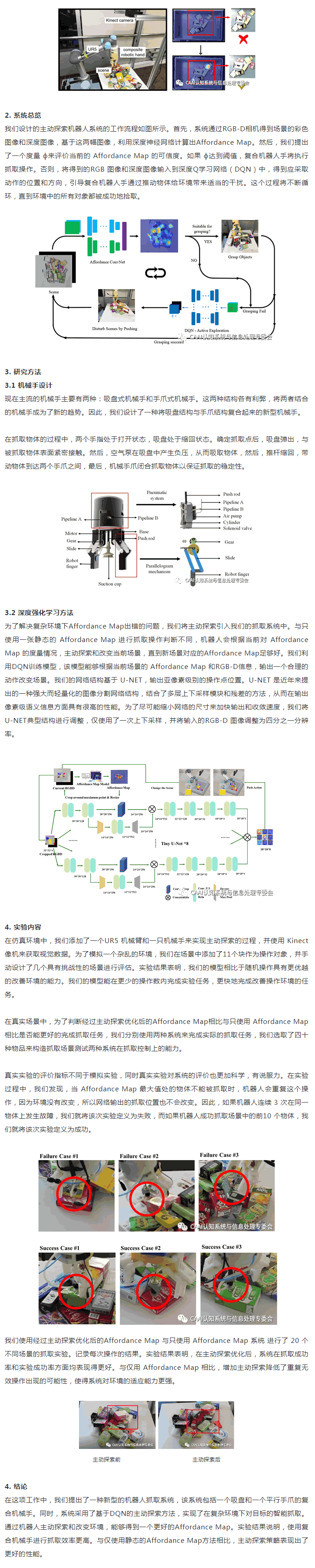學(xué)術(shù)界和工業(yè)界都在尋求解決方案,許多研究人員針對這一課題開展了工作。Andy Zeng 等人通過對整個場景的分析,提出了利用Affordance Map(一個包含每個抓取點的置信度的圖)來獲取抓取區(qū)域的方法,大大提G了抓取的效率。然而,由于環(huán)境通常是復(fù)雜和無結(jié)構(gòu)化的(例如混亂的場景),有時機器人很難找到合適的位置來抓住物體。