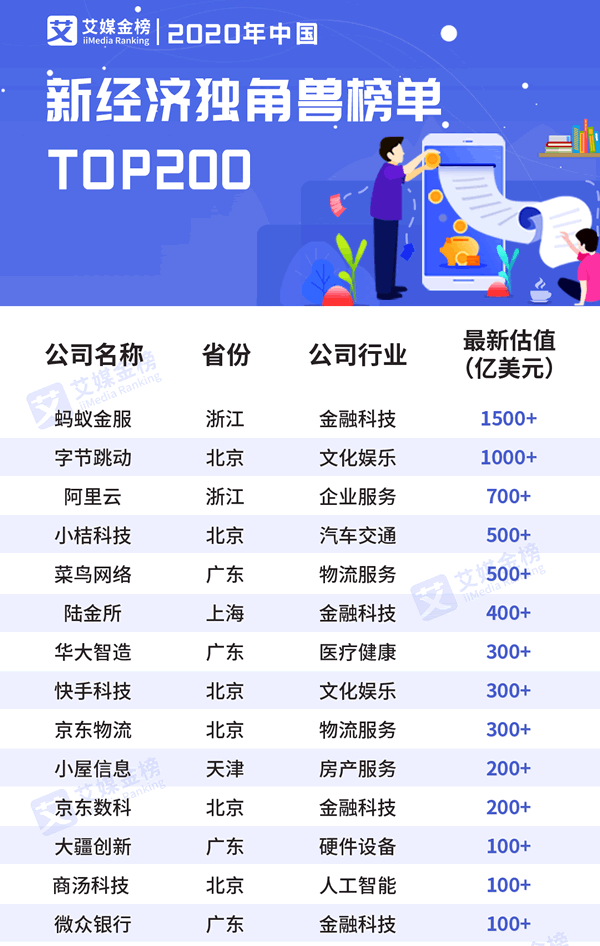 近日,數據挖掘和分析機構iiMedia Research(艾媒咨詢)權威發布《2020中國新經濟獨角獸200強榜單》。本排行榜中企業評選對象為估值超過10億美元的未上市企業,相關信息統計截至2020年7月10日。