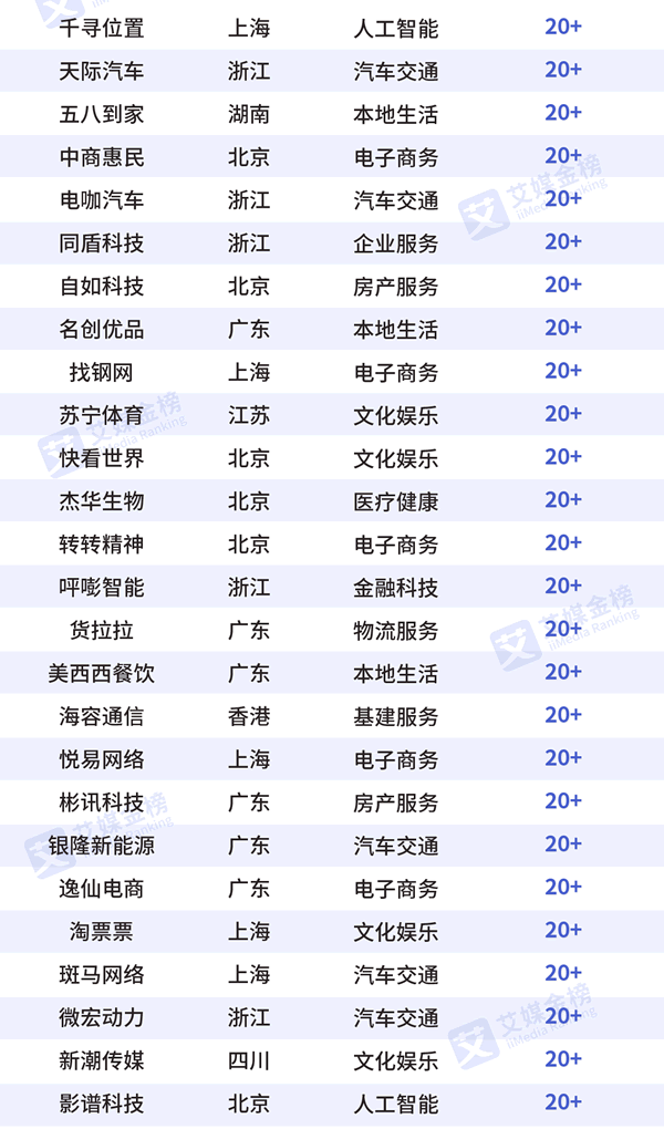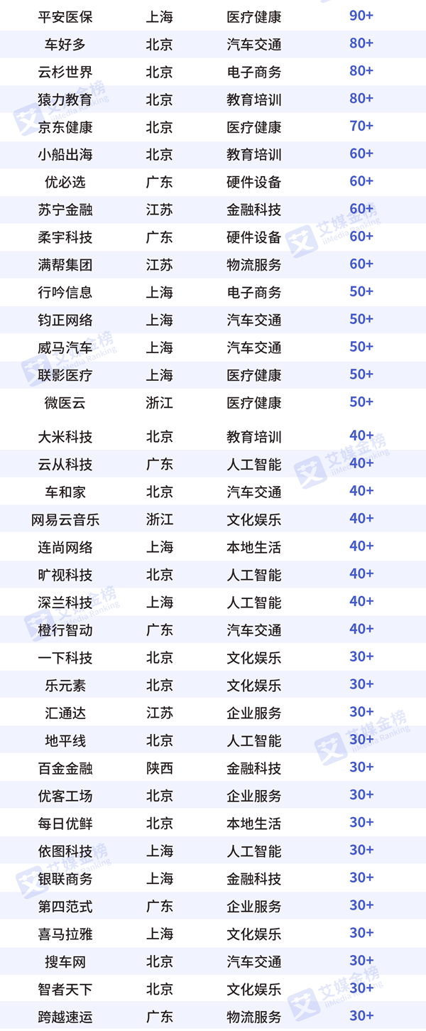 字節跳動,螞蟻金服,滴滴出行,快手,陸金所,菜鳥網絡,京東數科,微眾銀行,馬上金融,商湯科技,京東物流,曠視科技,優必選