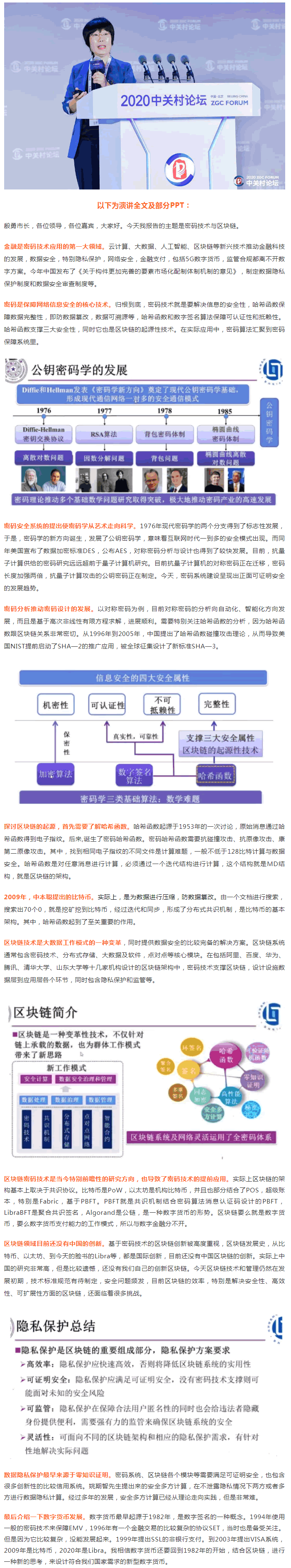 在2020中關村論壇上,中國科學院院士,國際密碼協會會士(IACRFellow),清華大學G等研究院“楊振寧講座”教授王小云發表《密碼技術與區塊鏈》主題演講。