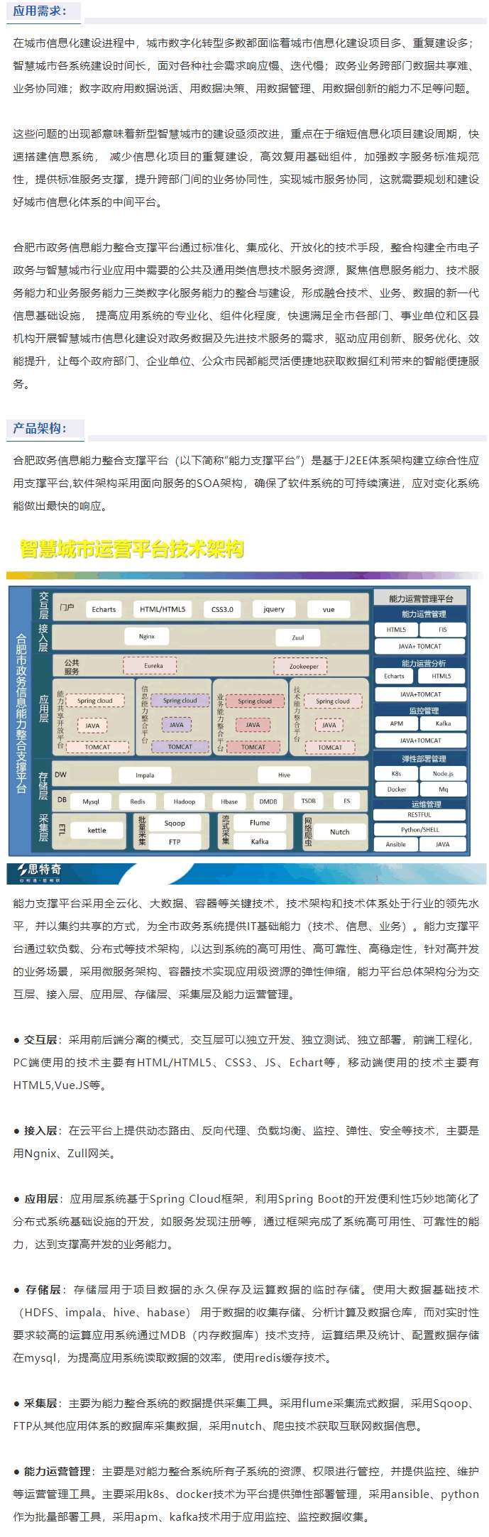 2、政務服務賦能。能力支撐平臺正在著力構建包括信息能力、業務能力、技術能力在內的2000多類信息技術服務能力, 旨在為各城市管理者、城市居民、城市服務機構提供惠民、強政、興業的服務應用支撐。截至目前,能力支撐平臺累計能力調用總次數達460多萬次,為不動產登記、數字蜀山、住房保障、合肥通等重大專項應用提供24小時不間斷業務賦能。助力加快推進政務信息技術資源整合與共享應用,助力初步實現全市基礎信息服務資源一體化管理格局,大大減少城市服務申請及辦理的時間、精力、物力和人力成本,跑腿次數減少了, 提交材料減少了,辦事時間縮短了,大大提升了城市服務滿意度和獲得感。