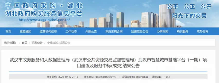 2020年10月10日,武漢市智慧城市基礎平臺(一期)項目建設及服務中標(成交)結果公告發(fā)布,武漢烽火信息集成技術有限公司(聯(lián)合體:騰訊云計算(北京)有限責任公司34997萬元中標。