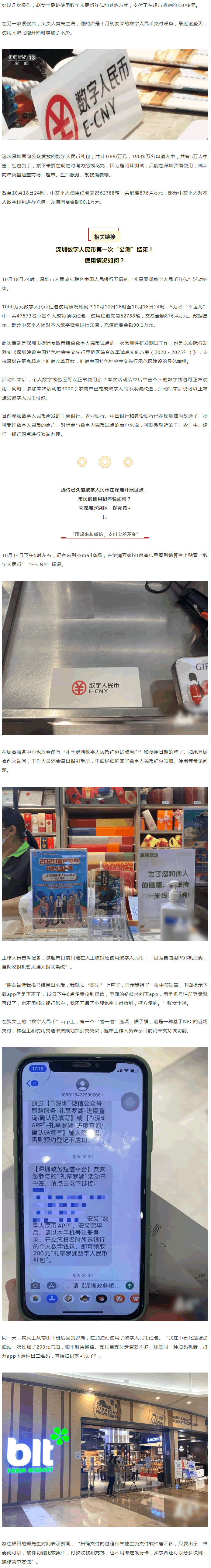 10月12日晚間,中簽者陸續收到了“禮享羅湖數字人民幣紅包”活動的通知短信。根據短信中提供的鏈接,下載安裝數字人民幣APP,注冊登錄后就會彈出一個紅包,顯示“數字人民幣”的圖案,可前往羅湖區已完成數字人民幣系統改造的3389家商戶消費。記者跟隨中簽者吳先生,前往他公司附近的這家超市購物時,看到除了人工通道可以使用數字人民幣支付,自助結賬機也可以使用,還有專人提供問詢、指導等服務。