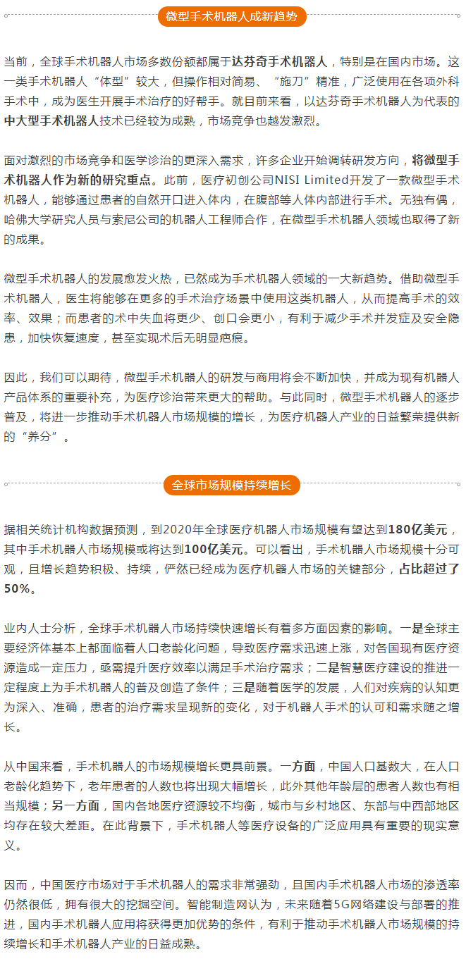 傳統的手術方式存在著準確度、耗費時長、視野角度等多方面問題,而手術機器人的應用可以很好地解決上述難點。通過手術機器人來輔助進行手術,具有準確度G、出血量少、創傷面小、恢復速度快等優勢,得到了醫生、患者