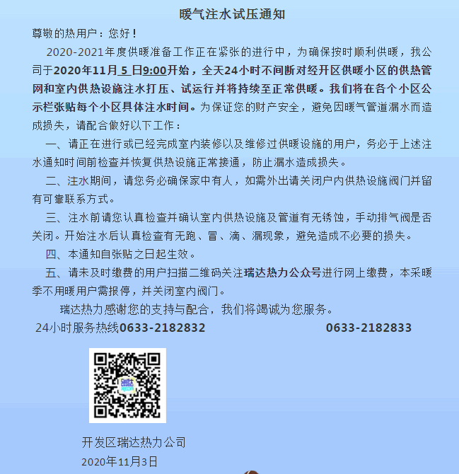 日照主城區試供熱,11月15日起達標供熱,供熱時間為11月15日至次年的3月31日,