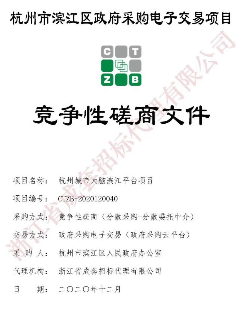 項目編號:CTZB-2020120040,項目采購內容為杭州市濱江區人民政府辦公室所需的杭州城市大腦濱江平臺,主要內容包括杭州城市大腦濱江平臺相關的數字樞紐基礎能力平臺軟硬件租賃服務、運維服務