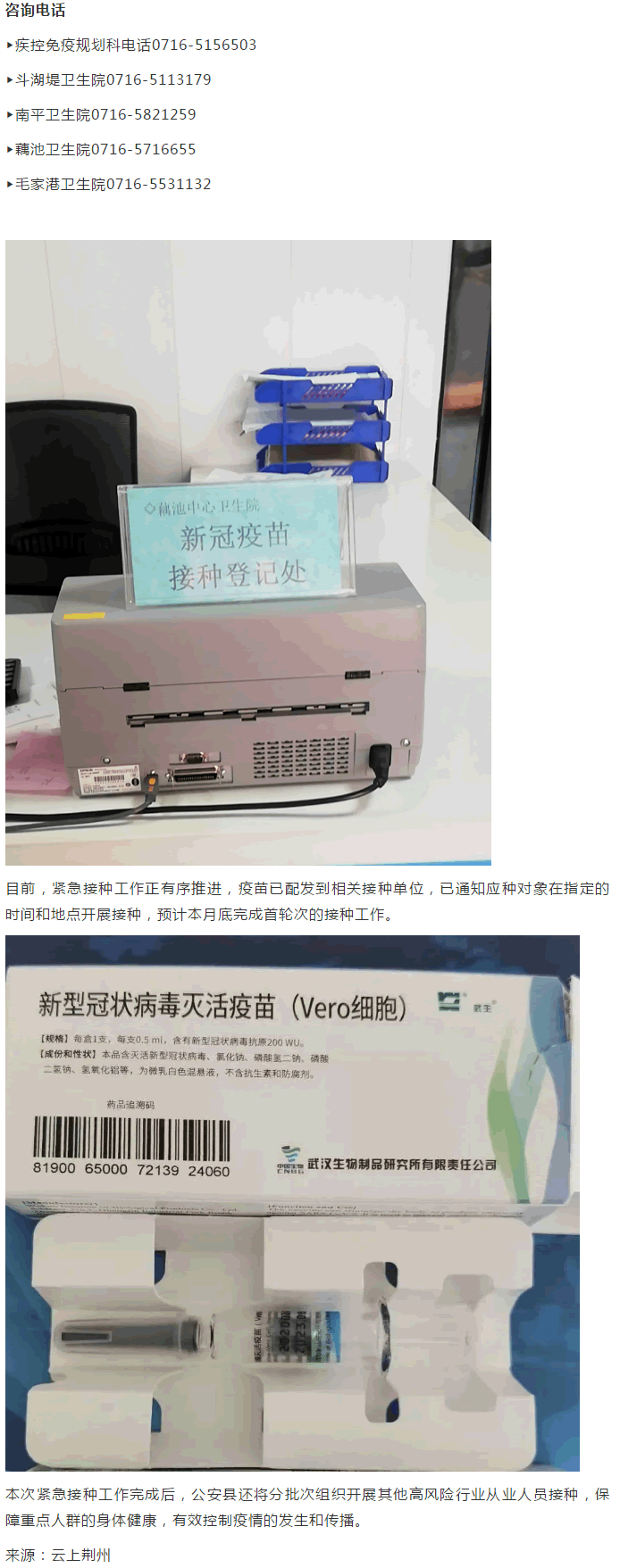為使接種工作安全有序,公安縣確定了4家醫院承擔全縣新G疫苗緊急接種工作,優先為冷鏈相關行業從業人員免費接種新G疫苗,同時指定了縣人民醫院為新G疫苗緊急接種異常反應定點處理醫院。