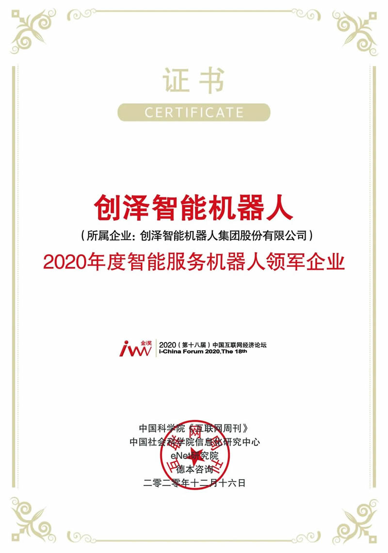 創(chuàng)澤智能機(jī)器人榮獲2020年度智能服務(wù)機(jī)器人L軍企業(yè)獎 |