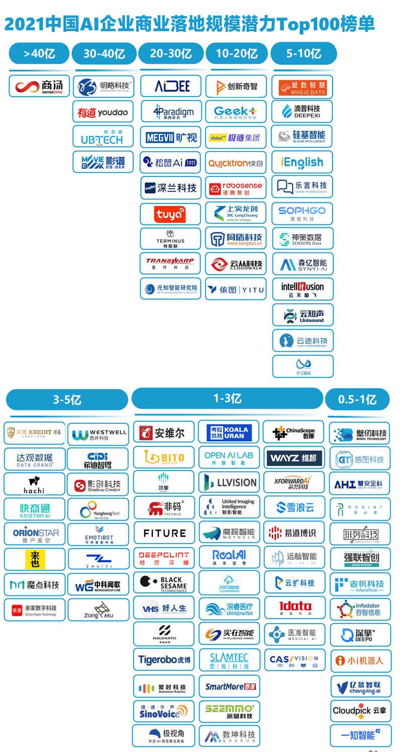 2021中國AI企業商業落地規模潛力Top100榜單